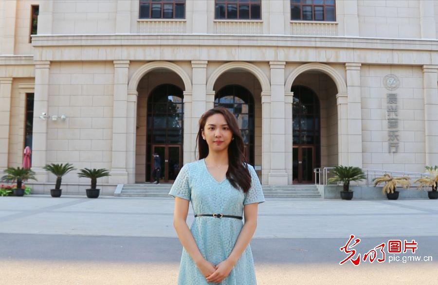 2022年4月30日,北京航空航天大学(学院路校区),机械工程及自动化学院18级本科生徐婧予在北航晨兴音乐厅前。积极投身于文艺事业的徐婧予认为,文艺是时代的号角,文艺工作者身逢盛世,肩负重任,希望在自己的演出中能够更多地展现中国航空航天特色,发出时代之声。