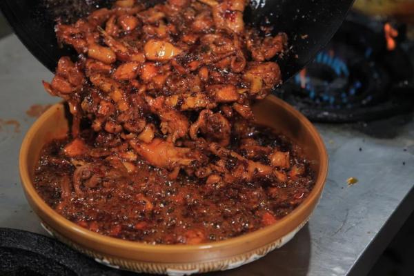 炒辣子鸡所用辣椒,选用的是辣味适中的二道辣椒。辣椒经晒干或烘干后,加入姜蒜等制作成贵州人特别喜爱的“糍粑辣椒”。待鸡肉焖熟后,将“糍粑辣椒”入锅与切好的鸡肉混合,再次通过一定火候的翻炒炼制,达到糯而松的程度,这个辣子鸡才算可以起锅上桌了。