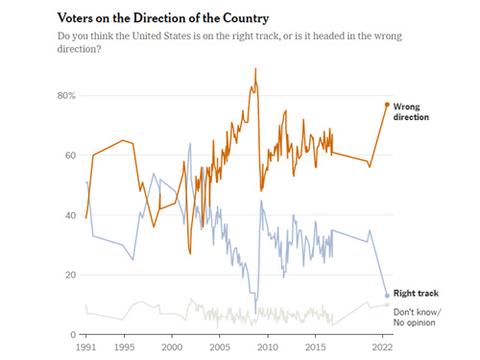 当地时间7月11日,《纽约时报》与锡耶纳学院发布的联合民调显示,77%的受调查者认为美国“正朝着错误的方向前进”,仅13%的人持相反态度——这又是一个创历史新低的数据。被高通胀、经济衰退、枪支暴力、堕胎权等一系列经济社会问题压得喘不过气的美国人再一次对华盛顿的精英们发出了不满的声音。
