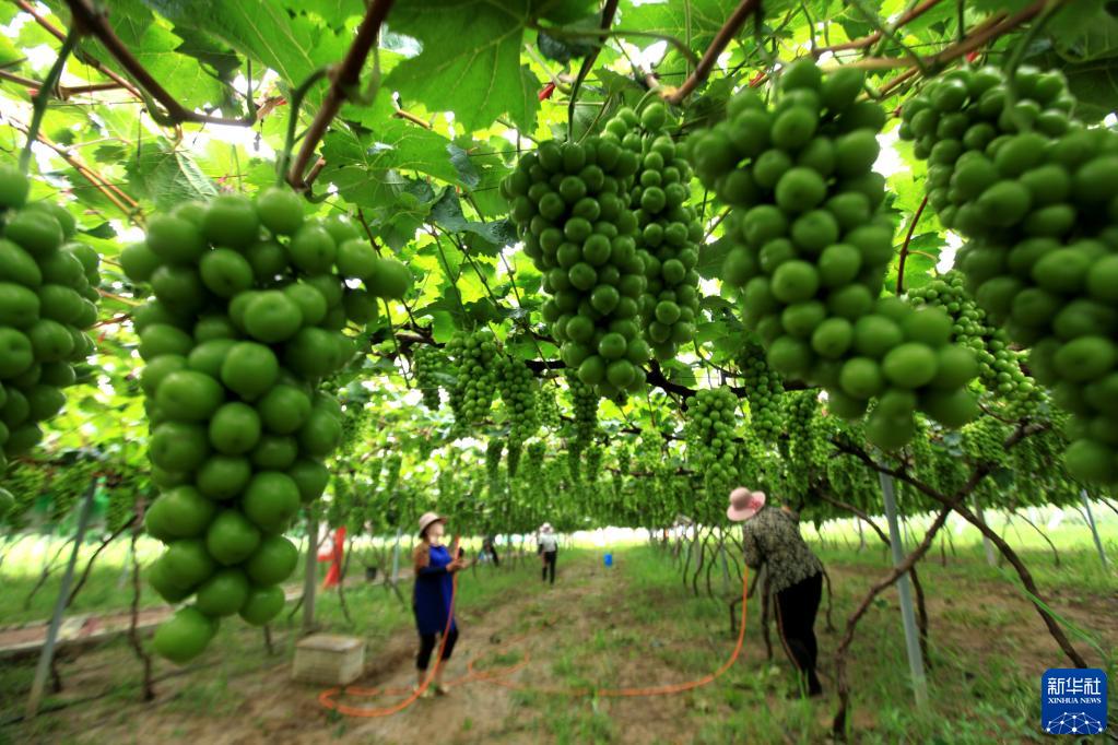 7月21日,在山东省临沂市平邑县地方镇下坡村,村民在管护晚熟葡萄。