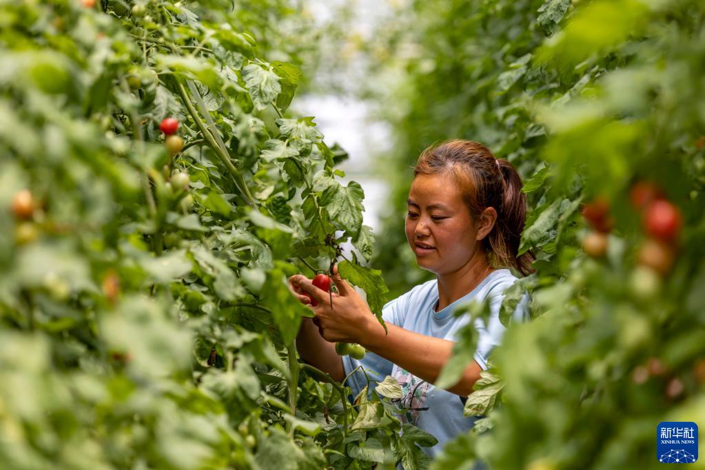 7月21日,村民在贵州省黔西市林泉镇清塘村蔬菜种植基地采摘圣女果。