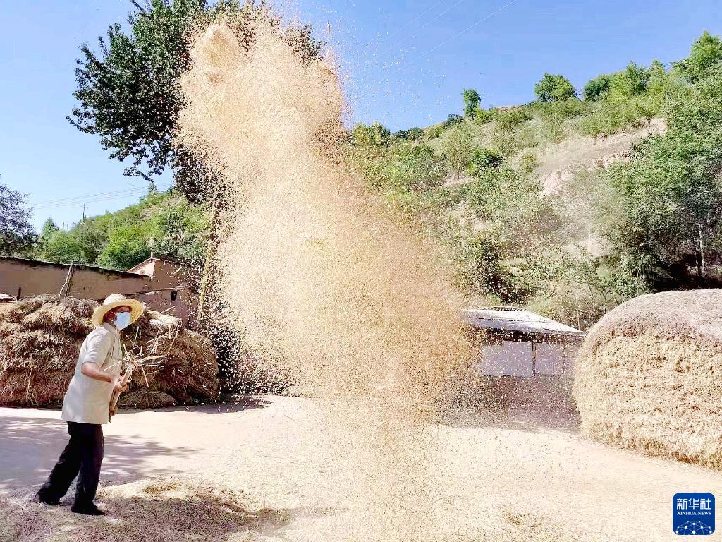 7月20日,在甘肃省平凉市静宁县红寺镇甘湾村,村民在晾晒场上忙碌。