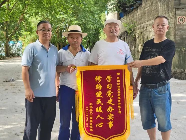 贵阳北极星养老服务有限公司修缮辖区道路的举措,使辖区的道路面貌焕然一新,得到了职工、村民的赞许。宿舍区退休人员看着自己每日经过的路面变得干净平整,专门送来锦旗表示感谢。