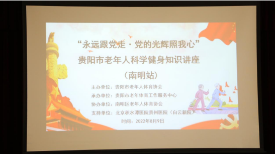 8月9日,“永远跟党走·党的光辉照我心”贵阳市老年人科学健身知识讲座(南明站)在南明区老干活动中心举行。本次活动由贵阳市老年人体育协会主办,贵阳市老年体育工作服务中心承办,南明区老年人体育协会协办,北京积水潭医院贵州医院提供医技资源支持。