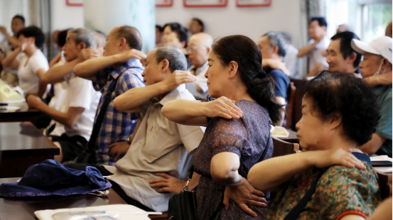 刘婷护士现场展演颈椎保健操,将活动的气氛推向了一个高潮,在座老人有用手机拍摄,有用文字记录,更有不少人直接跟着节拍舞动起来,现场气氛十分活泼。