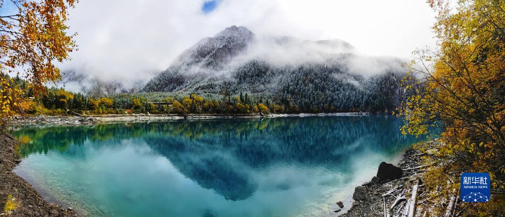 这是10月7日在世界自然遗产地九寨沟拍摄的雪后景色(拼接照片)。