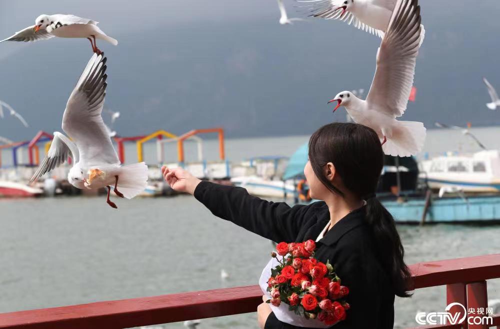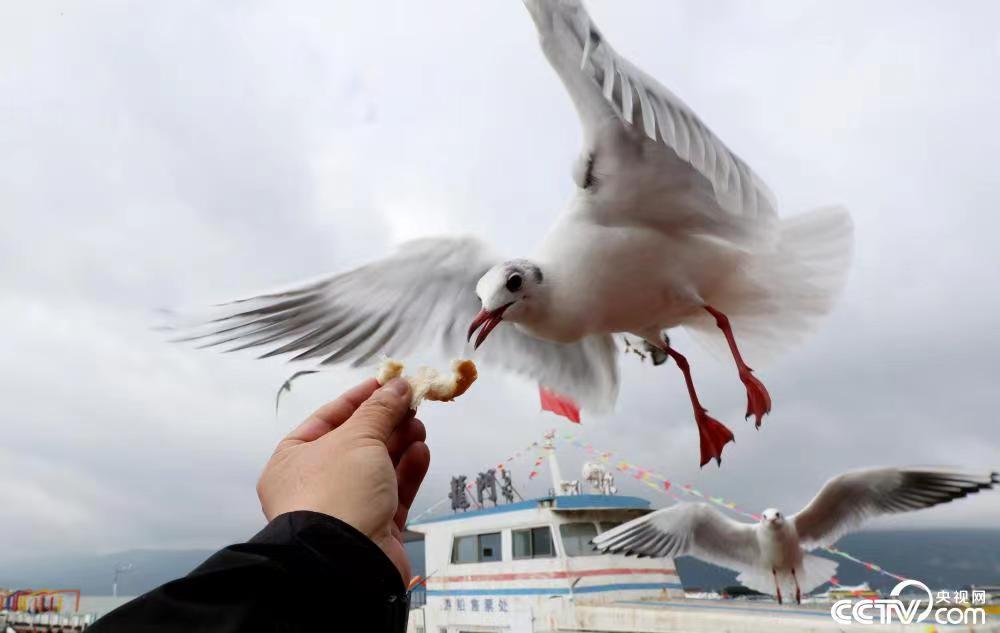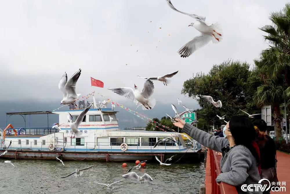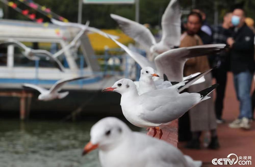 10月13日,昆明,在海埂东码头滇池水域,500多只红嘴鸥在岸边觅食。当日,海埂东码头滇池水域的红嘴鸥数量明显增加,昆明迎来观鸥季。