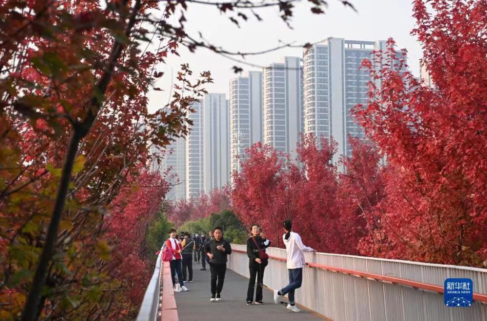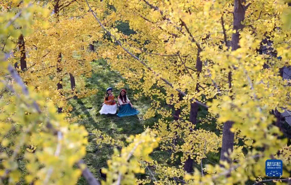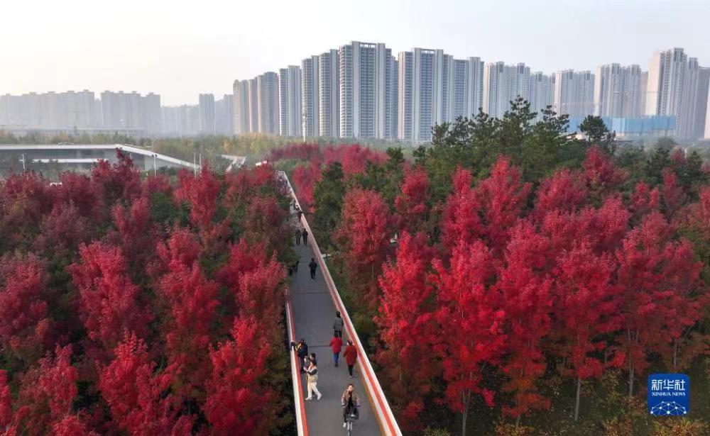 这是10月18日拍摄的西安雁南公园景色(无人机照片)。近日,古城西安市雁塔区雁南公园里秋色正浓,吸引游客赏景游玩。