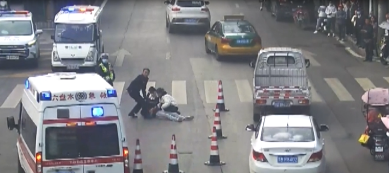 贵州一学生过马路时突然发病 大伙从四面八方跑来救人