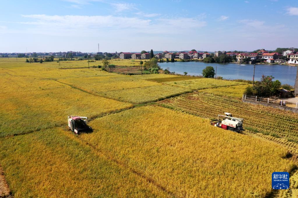 10月20日,在江西省南昌市南昌县广福镇漳溪村,种植户在收割晚稻(无人机拍摄)。