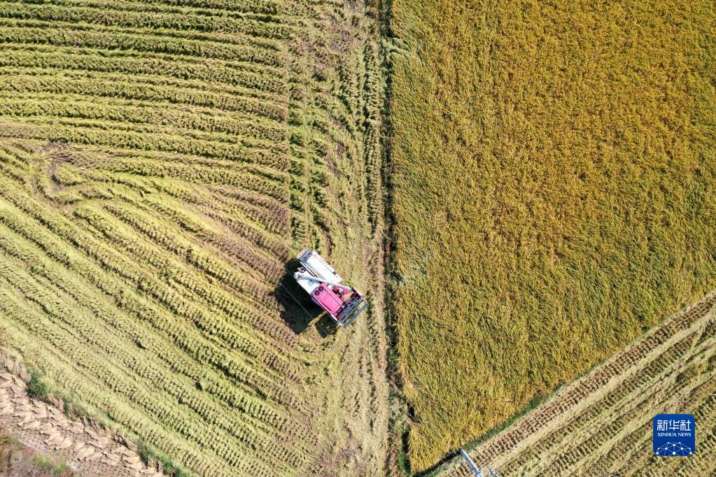 10月20日,在江西省南昌市南昌县广福镇漳溪村,种植户在收割晚稻(无人机拍摄)。