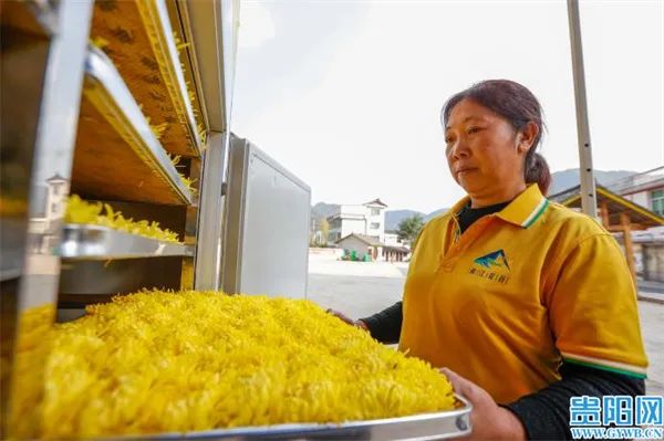 趁着秋日暖阳,苗寨村的村民们正穿梭在花田间,精挑细选出硕大、金黄的金丝皇菊,分拣、烘焙、制作成品供应市场……如今,从种植到深加工,苗寨村金丝皇菊全产业链已经形成,成为带动村民增收致富的新名片。
