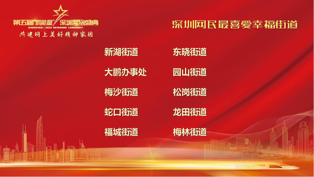 读特客户端·深圳新闻网2022年12月29日讯第五届深圳网络盛典,评出了“2022年深圳网民最喜爱幸福街道”和深圳区级融媒体优秀传播平台。