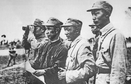 1947年5月孟良崮战役前夕,陈毅(左一)、粟裕(左二)等到前沿阵地视察