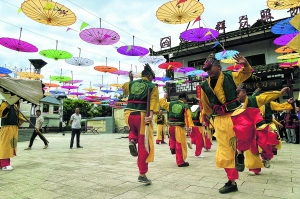 ▲白云区用好民族民俗文化资源发展旅游业,省级非遗项目蓬莱地戏表演吸引游客。