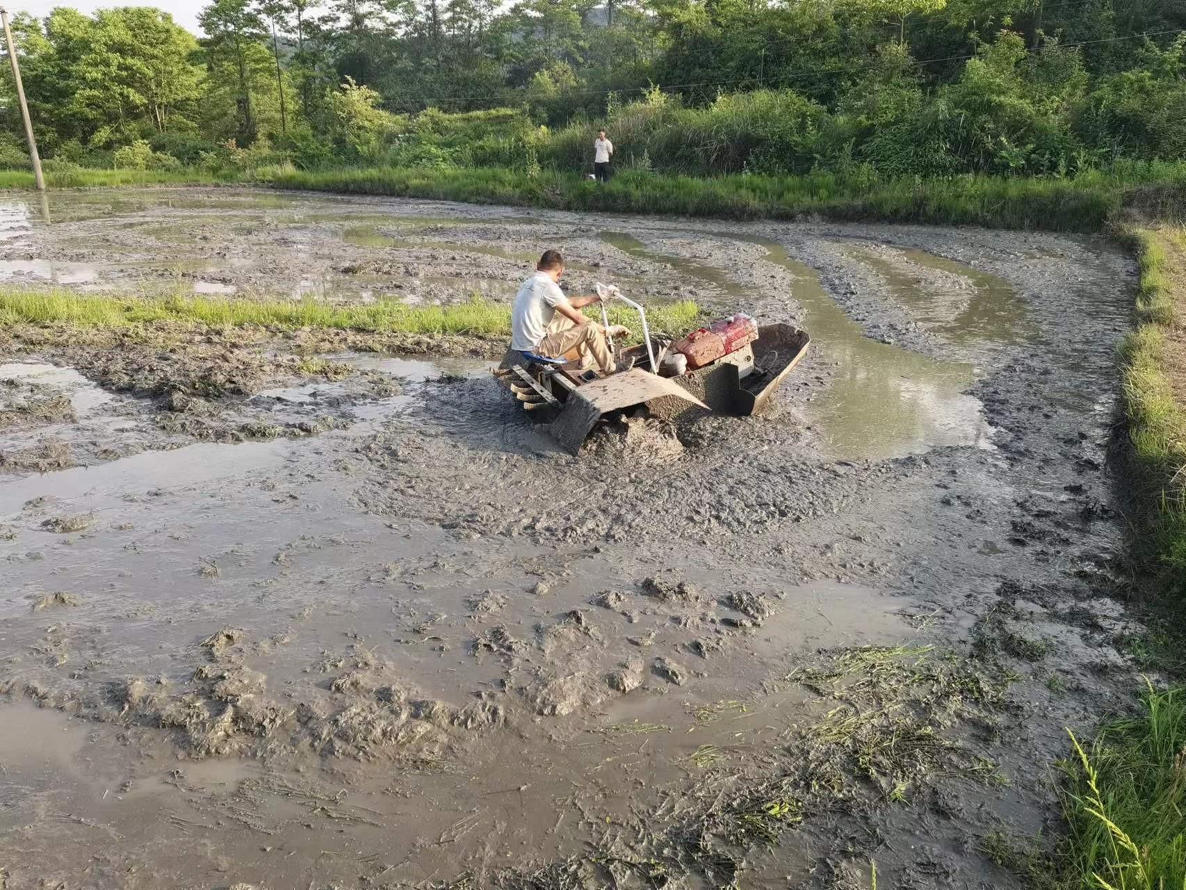 李昌金驾驶自己改进机耕船进行烂田作业。