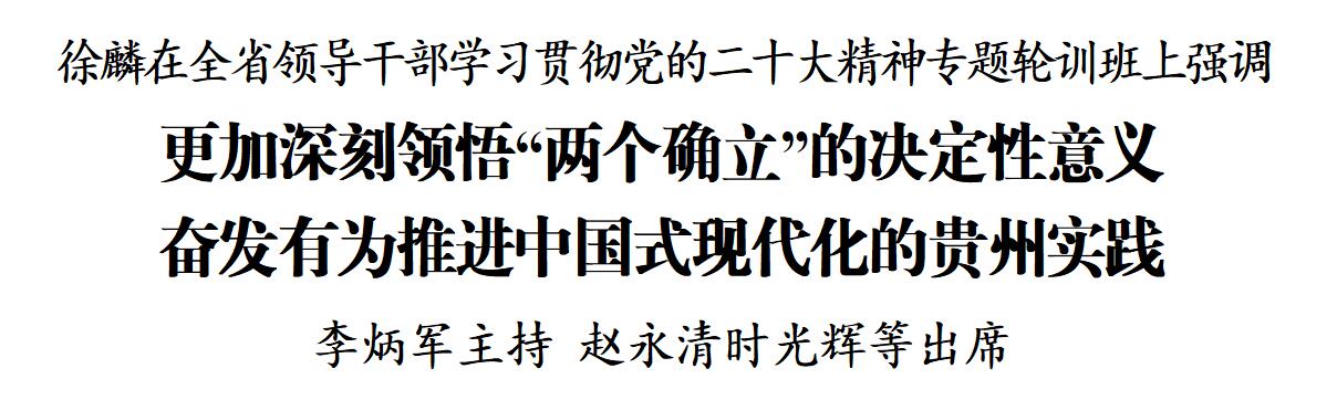 2月22日,全省领导干部学习贯彻党的二十大精神专题轮训班在省委党校举行。省委书记、省人大常委会主任徐麟出席并讲话。他强调,要深入学习贯彻习近平新时代中国特色社会主义思想和党的二十大精神,深入学习领会习近平总书记在学习贯彻党的二十大精神研讨班开班式上的重要讲话精神,正确理解把握中国式现代化的理论体系和实践要求,更加深刻领悟“两个确立”的决定性意义,更加坚定自觉衷心拥护“两个确立”、忠诚践行“两个维护”,奋发有为推进中国式现代化的贵州实践。