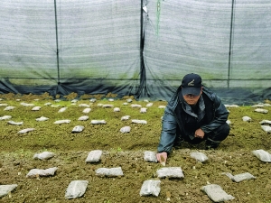 羊昌镇甲岗村蔬菜大棚管护人员在查看羊肚菌长势。