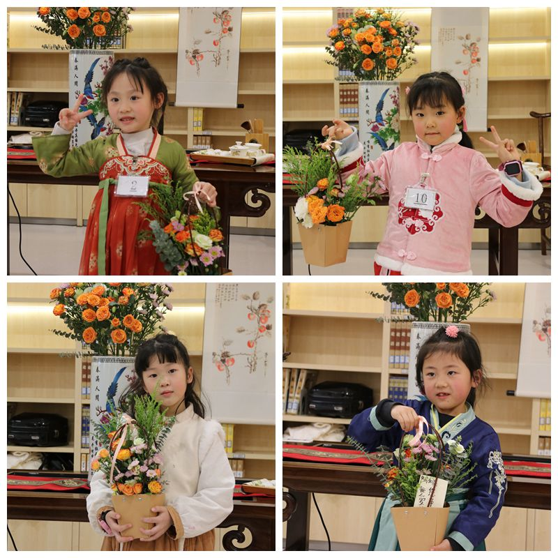 3月4日下午两点半,活动在二楼国学馆开展。伴随着古典的乐曲,小朋友们身着汉服,神采俊逸地进入古风古韵的国学馆参加活动。老师先向小朋友们讲解了传统的花朝节文化,接着讲述了十二花神的历史和传说人物,引导小朋友们感受古诗词中“花的馨香”。随后,老师带领小朋友们体验了簪花、吟花词和赏红等传统习俗,并增添了有趣的游戏环节,引导小朋友们使用古诗词作答,现场气氛高涨。最后,老师向小朋友们介绍了宋代插花理念并科普了插花技巧,经过选花、造型、包装等过程,小朋友们都完成了自己精美的插花作品。