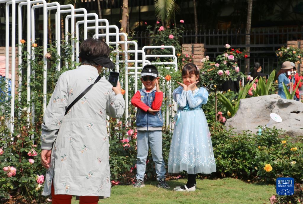 3月8日,两名小朋友在深圳人民公园花展现场留影。