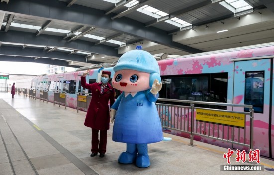 3月8日,地铁工作人员和吉祥物“鱼快快”合影留念。当日,“樱花地铁专列”在湖北武汉轨道交通1号线和8号线同步上线亮相。中新社记者张畅摄