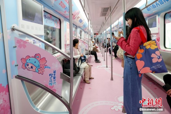 3月8日,市民乘坐8号线“樱花地铁“出行。当日,“樱花地铁专列”在湖北武汉轨道交通1号线和8号线同步上线亮相。中新社记者张畅摄