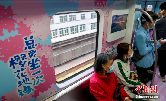 3月8日,市民乘坐1号线“樱花地铁“出行。当日,“樱花地铁专列”在湖北武汉轨道交通1号线和8号线同步上线亮相。中新社记者张畅摄