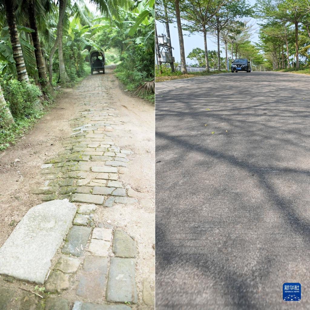 这是一张拼版照片,左图为1999年5月1日拍摄的一辆三轮车行驶在乐城村内石砖小道上(新华社发,蒙钟德摄);右图为2023年3月24日拍摄的一辆汽车行驶在乐城村内水泥路上(新华社记者蒲晓旭摄)。