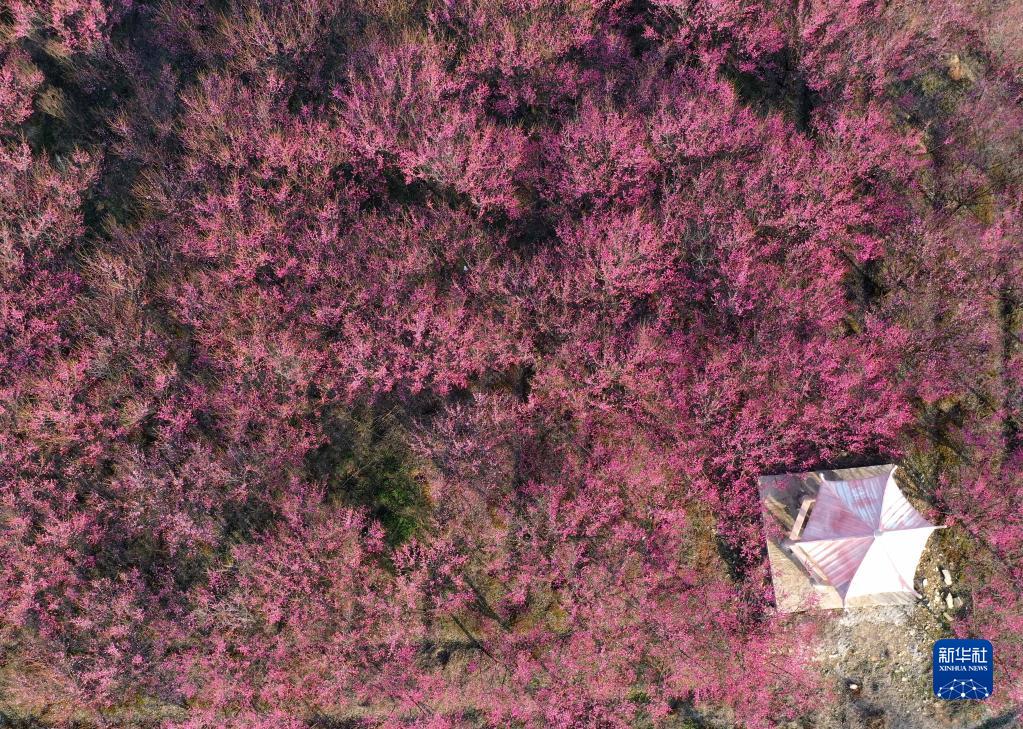 早春时节,位于安徽省巢湖市庙岗镇清水湾梅花园的千亩梅花相继盛开,朵朵梅花如霞似火,吸引人们徜徉花海,感受春日的美好。