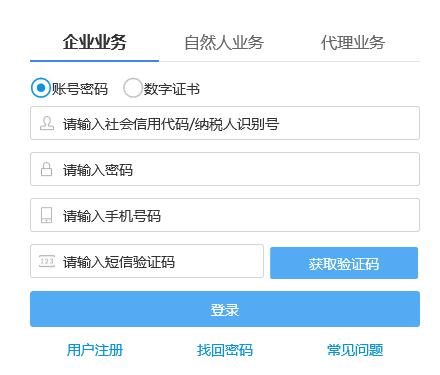 第一步:企业业务办理入口,输入社会信用代码、密码、手机号之后,点击“获取验证码”: