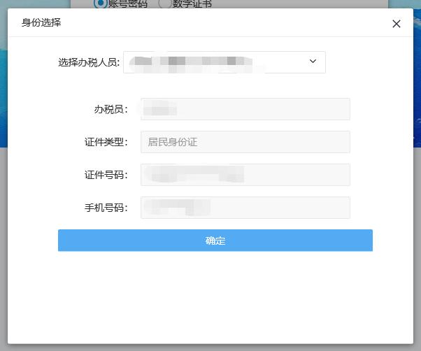 第三步:①如果在步骤2中输入的手机为法人、财务负责人、办税人在系统中登记的手机号,在弹出窗口中确认办税人信息后,点击确定即完成登录。