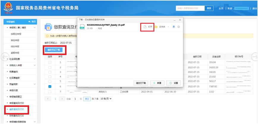 缴款成功后,可在功能菜单中点击【缴款查询及打印】查询缴款情况,点击【缴款凭证下载】,选择【打开】直接查看,或选择【保存】到电脑桌面,即可开具电子缴款凭证。
