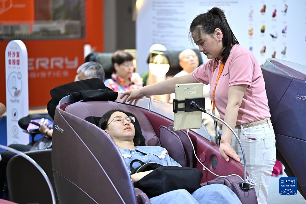4月14日,观众在消博会上体验按摩沙发。
