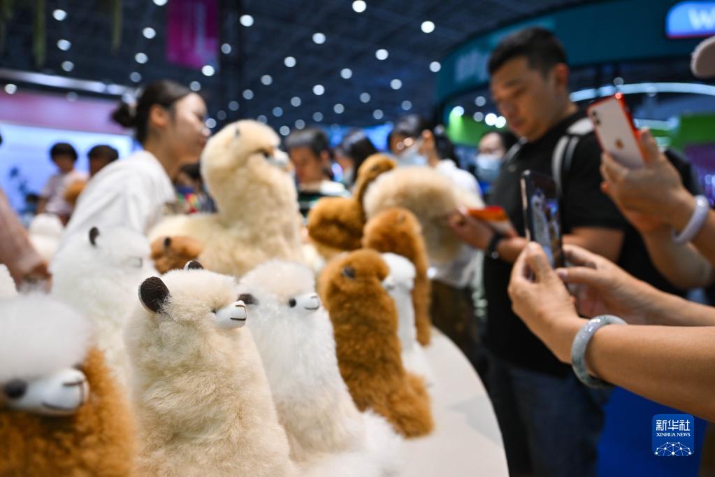 4月14日,观众在消博会现场选购羊驼绒玩偶。