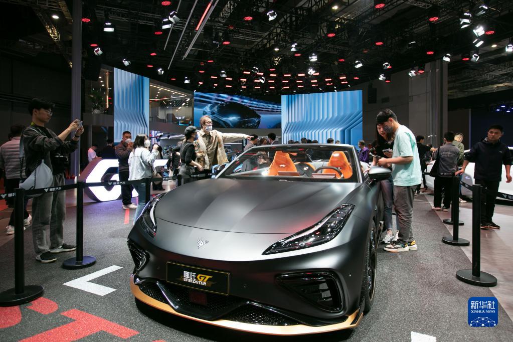 4月25日,参观者在哪吒GT展车边驻足观看。