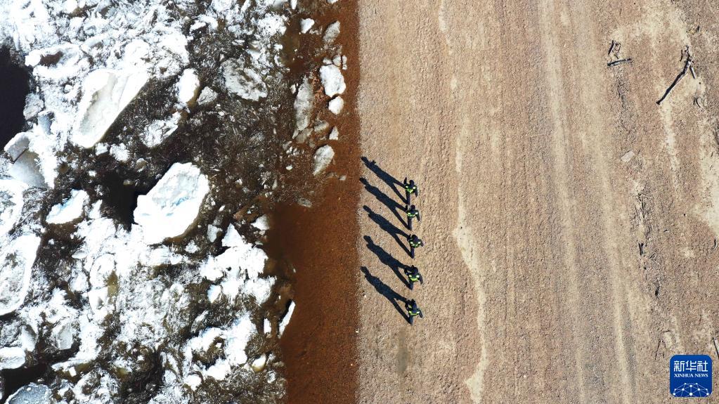 4月24日,黑龙江出入境边防检查总站黑河边境管理支队大黑河岛边境派出所民警在黑龙江黑河段江岸巡逻,确保安全(无人机照片)。