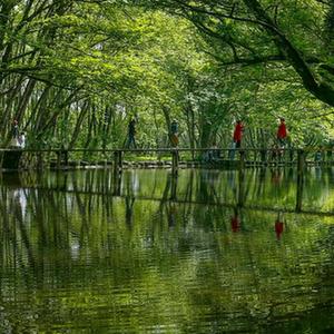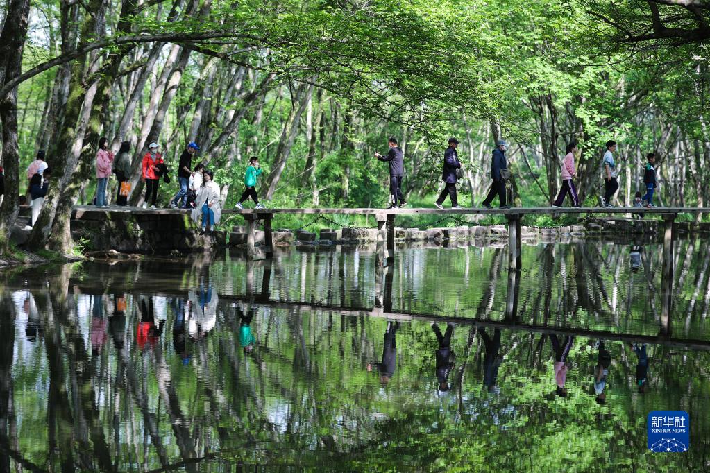 4月7日,游客在黄山市徽州区西溪南湿地踏青赏景。