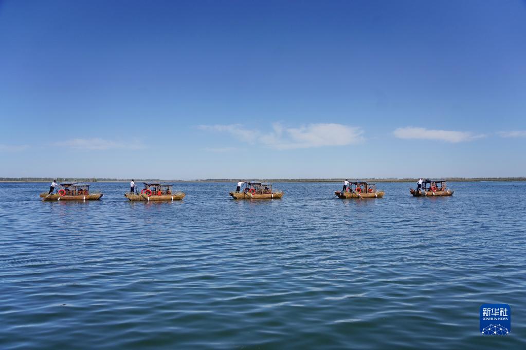 4月7日,处于试运营阶段的白洋淀“水上巴士”项目生态木船在白洋淀内行驶。