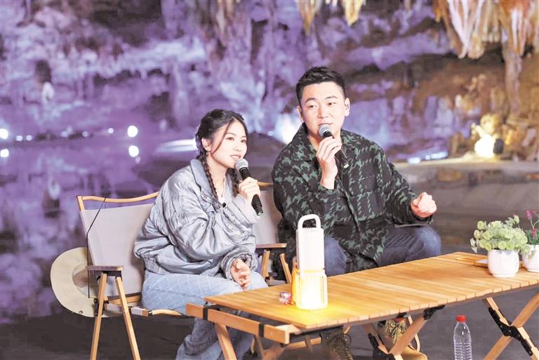 看山听水、观洞K歌、自由呼吸,四位歌手在溶洞里、在游船上忘情歌唱,优美的旋律与动听的嗓音徜徉在山水间、溶洞里,与自然完美融为一体,浑然天成。直播平台上的观众沉浸在山水、溶洞与音乐中,纷纷点赞、留言、打call,直播间内互动频繁,人气旺盛。