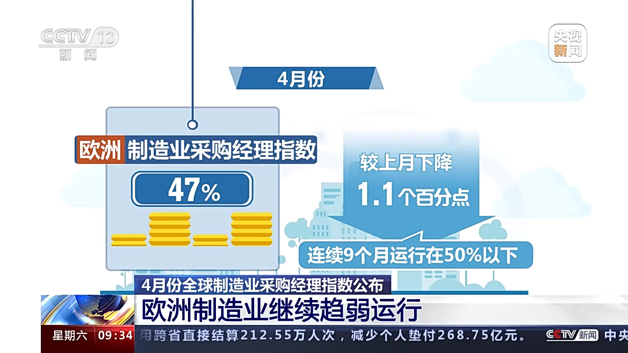 4月份,欧洲制造业采购经理指数为47%,较上月下降1.1个百分点,连续9个月运行在50%以下。从主要国家来看,德国、英国、法国和意大利制造业采购经理指数均在48%以下的较低水平。分析认为,地缘政治冲突、全球需求收缩和银行危机带来的信贷紧缩都将成为拖累欧洲经济复苏的因素。