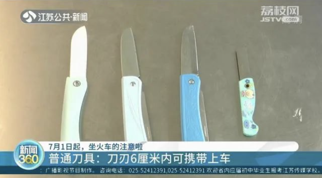 江苏公共·新闻频道《新闻360》报道:2022年7月1日起,刀刃在60毫米以内的可以携带上火车。 图源:江苏新闻