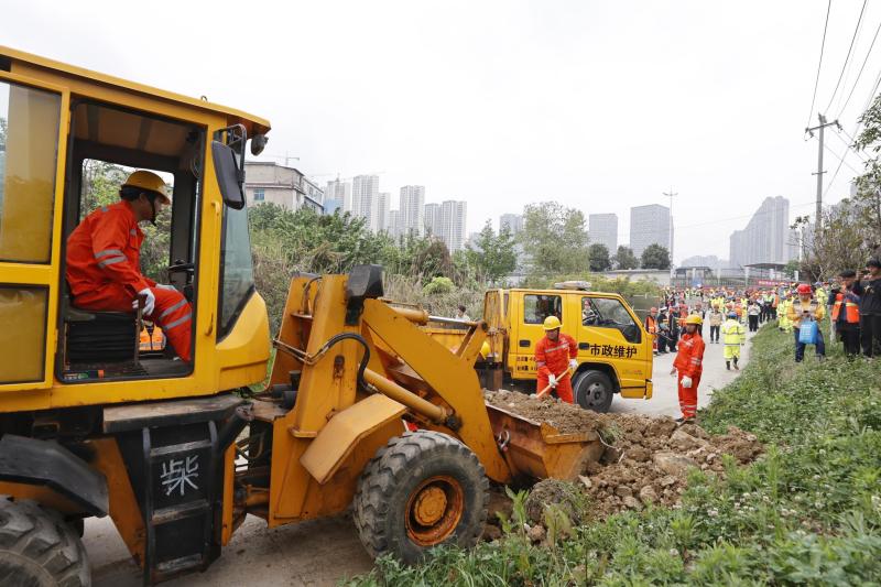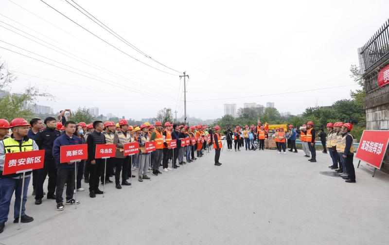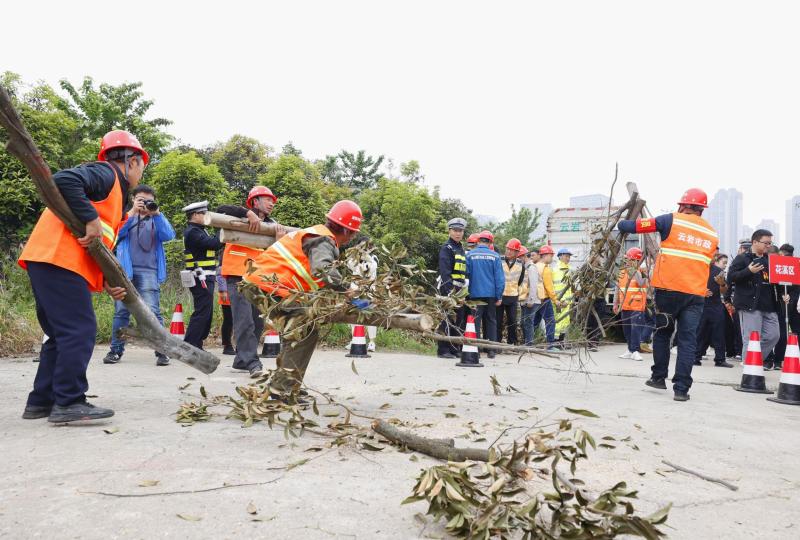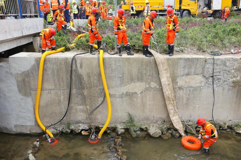 演习模拟贵阳市在24小时内连续降雨,降水量在200mm以上,强降雨导致城区高架桥、地下通道、下拉槽、地势低洼区域等多处大面积积水,多处进水井、检查井管道堵塞,边坡碎石滑落,树木遭遇大风折断倒伏在路上,黔灵山公园地下通道内积水,金钟河水位上涨,河流两侧水淹严重,水淹点路灯杆漏电,路灯电缆井进水有漏电隐患等场景,严重威胁群众生命财产安全,需统一调度贵阳市、区两级市政防汛队伍进行联合抢险处置。