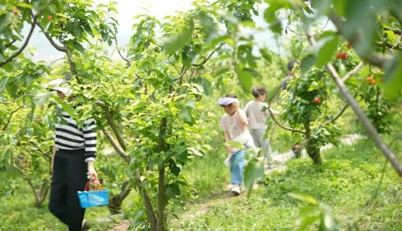 在下坝镇的一个个樱桃园,放眼望去,一颗颗玲珑可爱的红樱桃掩映绿树丛中,鲜嫩饱满的樱桃晶莹剔透,让人垂涎欲滴,众多游客穿梭其中,体验采摘乐趣,品尝春天的甜蜜。