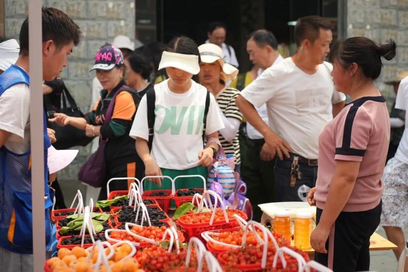 在颇具特色的乡村集市,品类丰富、价优物美的下坝原生态农产品,深受广大游客的青睐,樱桃酒、刺梨汁、南瓜面、绿壳蛋、卡堡豆腐、手工艺品……众多游客在享受甘甜可口的樱桃,领略下坝山水的风光后,满载而归。