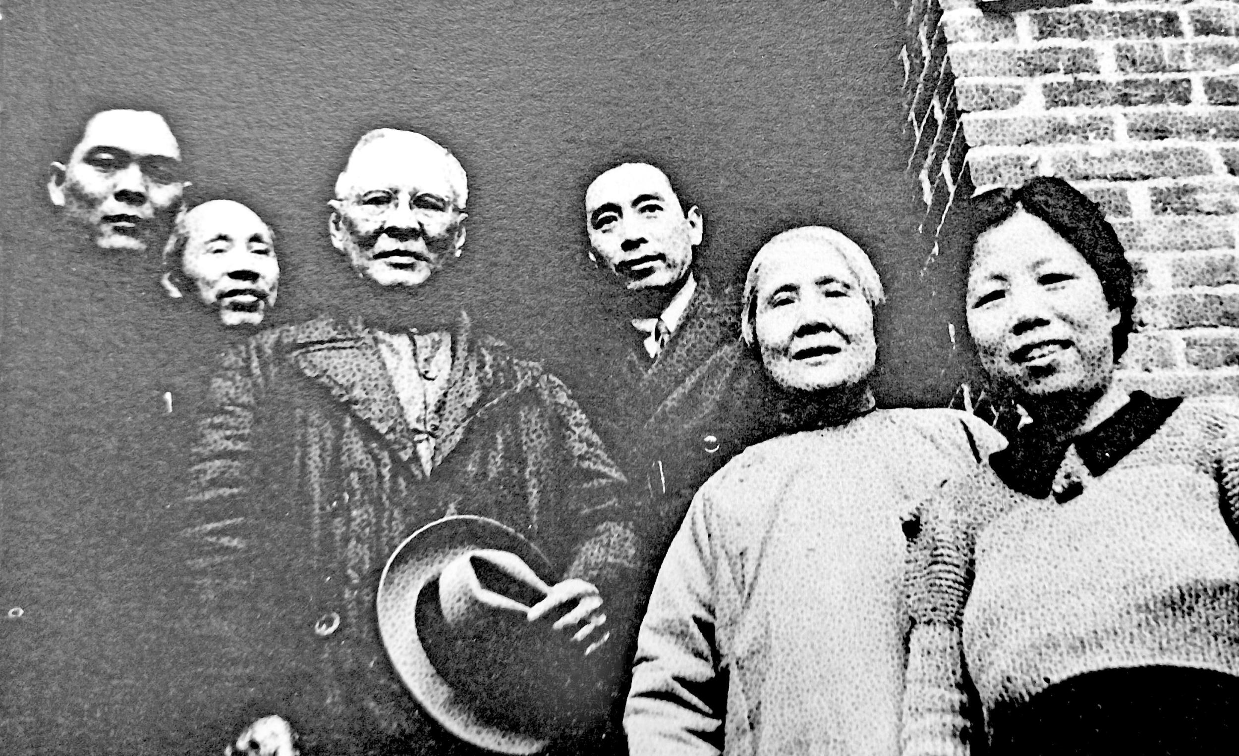 1941年冬,周恩来(左四)、董必武(左二)、邓颖超(右一)在重庆红岩村八路军驻渝办事处接待美国华侨领袖司徒美堂(左三)和黄兴夫人徐总汉(右二)时留影