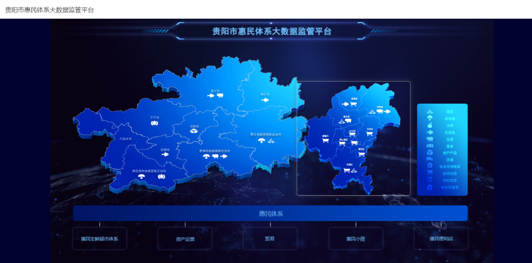 该平台投入使用后,可实现惠民生鲜体系大数据可视化分析、数据汇聚与动态更新、惠民生鲜体系实时监管、提升惠民生鲜超市管理效率等功能。通过大数据可视化分析,可直观展示惠民生鲜体系在“农民-市民”端的惠民利民作用,包括贵阳农投集团贵州省内基地产销分析、市场保供稳价分析、惠民商品价格对比分析等,从宏观层面为监管方提供决策辅助支撑。