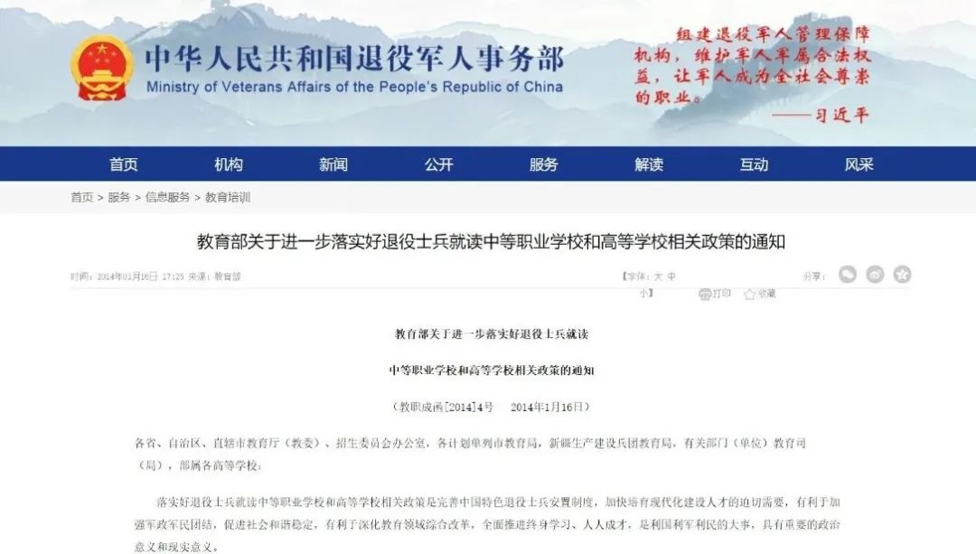 依据:《教育部关于进一步落实好退役士兵就读中等职业学校和高等学校相关政策的通知》(教职成函[2014]4号)