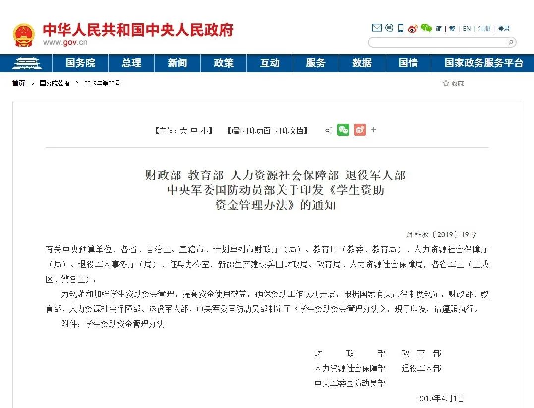 依据:《学生资助资金管理办法》(财科教〔2019〕19号)