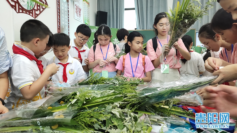 “‘入夏经月雨,园路久已荒。今朝偶一到,蒿艾如人长’。人们很早就认识到了艾草的功效,它既能食用,碾压成汁,和成青团;又能当作治病的医草,从而受到人们的欢迎。”在制作端午花束环节中,来自省府路小学的学生们向现场师生介绍了端午节挂艾草的习俗和缘由。