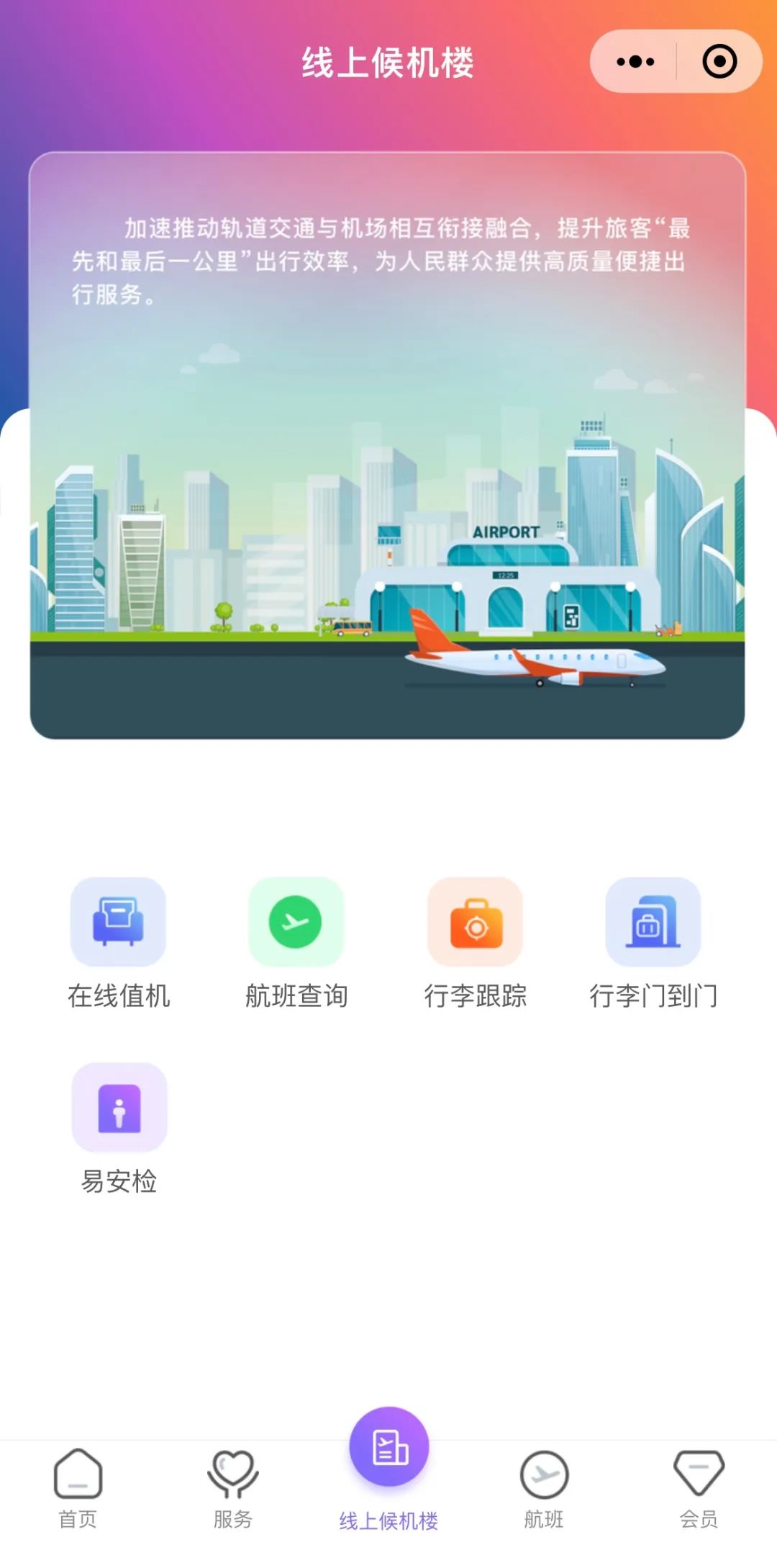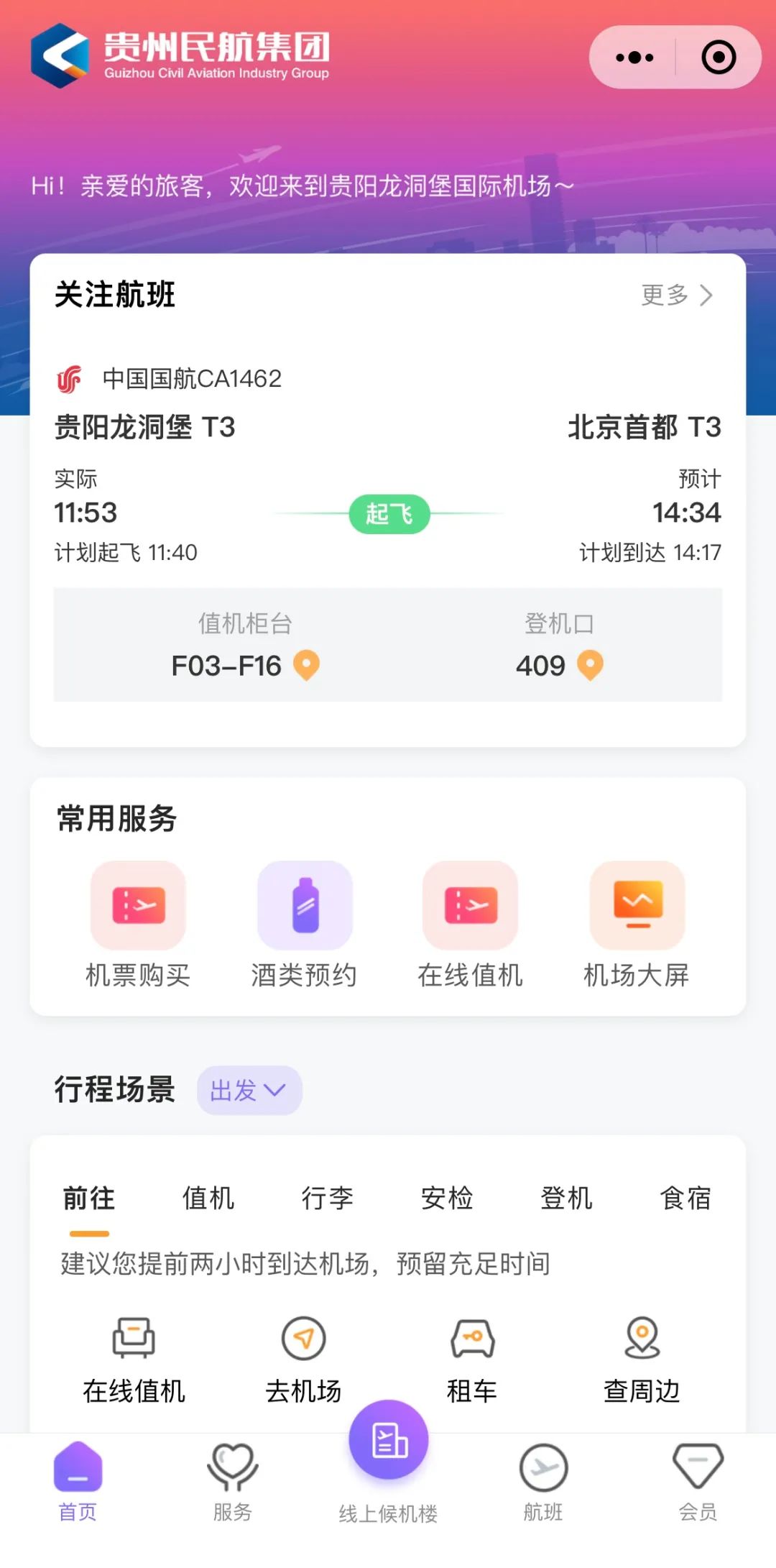 “贵阳机场”微信小程序覆盖了出发、到达、中转和接送机四大类行程场景,提供包含值机安检、行李寄存/跟踪、机场交通、服务帮助等27项子服务模块。当旅客在贵阳龙洞堡机场搭乘飞机出行时,可以通过该小程序实现在线值机、航班查询、行李跟踪、易安检预约等线上自助服务,减少排队等候时间,更方便快捷。在地面服务环节,提供特殊旅客、首乘旅客、母婴室等爱心服务,更好满足了不同旅客的个性化需求。